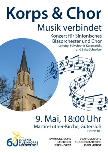 Gemeinsam mit der evanglischen Kantorei Isselhorst lädt das Jugendmusikkorps Avenwedde am 09. Mai 2026 um 18.00Uhr in die Martin-Luther-Kirche in Gütersloh ein. Unter dem Motto “Musik verbindet” steht das Konzert für Sinfonisches Blasorchester und Chor unter der Leitung von Polychronis […]