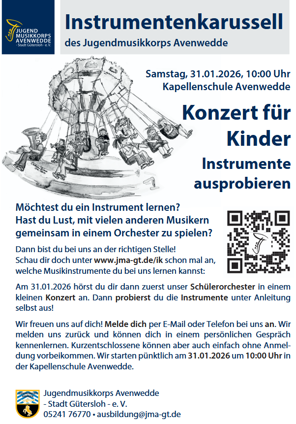 Am 31.01.2026 um 10.00Uhr findet in der Kapellenschule Avenwedde wieder unser Instrumentenkarussell statt. Dort hörst du dir dann zuerst unser Schülerorchester in einem