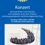 Am Sonntag, den 08. März 2026 findet um 15.00Uhr das Konzert des InnerWheel Club Güterslo zum Gedenken an Dr. Karin Zinkann, Gründungspräsidentin und Ehrenmitglied des Clubs mit dem Jugendmusikkorps statt.